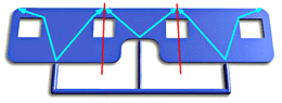 フロー パスのバランス調整をするために、成形品を仮想的に複数の領域に分割して、充填が同時に完了するようにします。下図の成形品を効果的に充填するには、3 つの射出位置が必要です。赤色のラインで分割される 3 つの領域では、充填が同時に終了することを示しています。図の薄青色の矢印は材料のフロー パスを、黄色のコーンは射出位置を示しています。