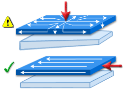 細長い成形品でゲートを中央に設けると、ゲート周辺での保圧、および成形品全体にわたる分子または繊維配向の差異により、収縮の差異が生じ、成形品の反りにつながります。長い成形品の一方の端にゲートを設けると、長さ方向における分子および繊維配向が均一になります。ゲート端は、他方端よりも保圧が高くなりますが、その結果生じる収縮の差異による反りは発生しません。