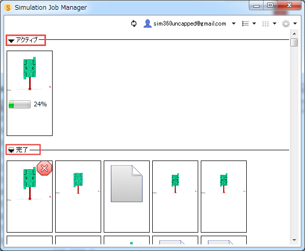 ジョブを実行するたびに、ジョブのサムネイル イメージが[アクティブ]セクションに表示されます。ジョブが完了すると、サムネイルは[完了]セクションに移動します。