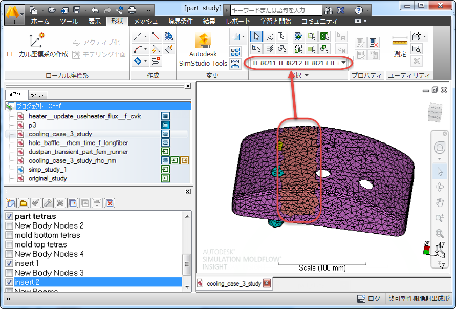 四面体要素には識別ラベル「TE」が割り当てられます。四面体要素を選択すると、文字 TE と後に続く数字で構成される識別子が選択リストに表示されます。