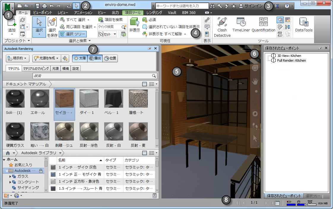 Autodesk Navisworks インタフェースは、理解しやすく、簡単に使用することができます。ユーザの作業方法に合わせてアプリケーション インタフェースを調整することができます。たとえば、使用頻度の低いドッキング可能ウィンドウを非表示にし、画面をすっきりさせることができます。リボン上およびクイック アクセス ツールバー上のボタンを追加または削除することもできます。