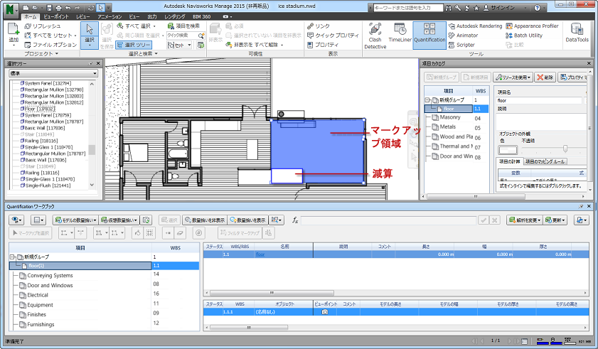 減算機能を使用して、ジオメトリの一部を切り取ります。減算を描画することで、既存の領域数量拾いの一部を除外できます。減算は、たとえば、数量拾いのために床の領域をマークアップしたが、そこに含まれるコリドー領域を除外したい場合などに役立ちます。Quantification ワークブックで廊下の減算領域は床の領域から「減算」されます。