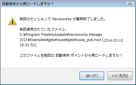 1. Autodesk Navisworks を起動します。 最後に作業していたファイルを再度読み込むようにメッセージが自動的に表示されます。