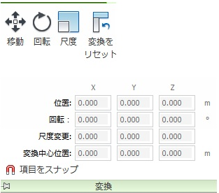[断面化ツール]タブ [変換]パネルのツールを使用すると、断面または断面ボックスの位置とサイズを調整して、モデルの限定した特定の領域を重点的に確認することができます。この調整は手動で実行することも、[移動][回転]、および[尺度]のギズモを使用することもできます。また、指定したフィールドに数値を入力して調整することもできます。