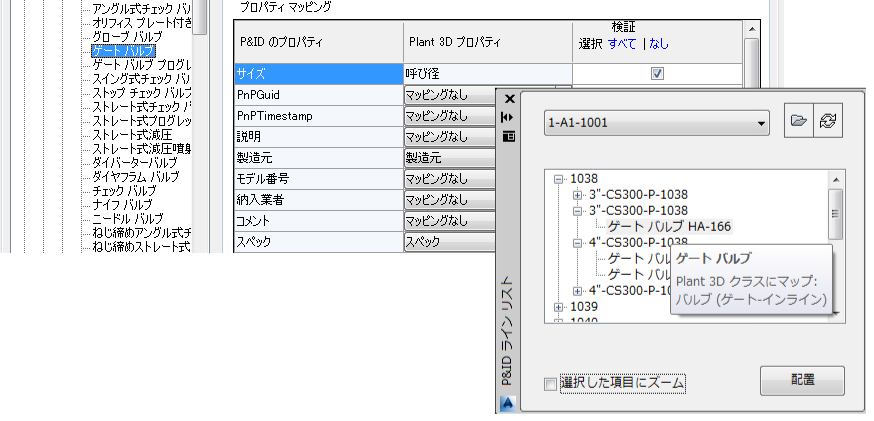 等価の Plant 3D オブジェクトをモデルに配置するには、P&ID オブジェクトが Plant 3D オブジェクトにマップされている必要があります。このリストで、マップされていない項目は配置できません。