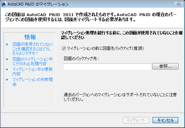 旧バージョンで作成された図面を現在バージョンで作成したプロジェクトに追加しようとすると、図面のマイグレーション ウィザードが起動します。マイグレーションは、プロジェクトに追加しようとしている図面のみをマイグレート処理します。旧バージョンでさらに図面の編集が必要になる場合に備えて、マイグレーション中にバックアップを作成できます。図面のマイグレーション処理をキャンセルすると、図面は元の状態に戻ります。
