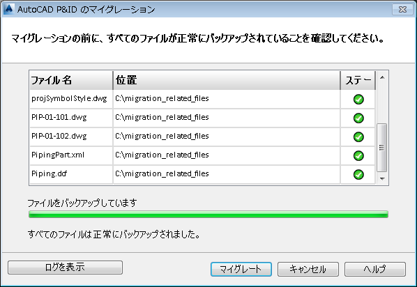 プロジェクト ファイルをバックアップすることを選択すると、プロジェクト マイグレーション ウィザードによって自動的にバックアップが実行されます。このバックアップには、プロジェクトと、バックアップに追加された追加のファイルに必要なファイルが含まれます。表には、各ファイルの名前とフォルダのパスが動的に表示されます。