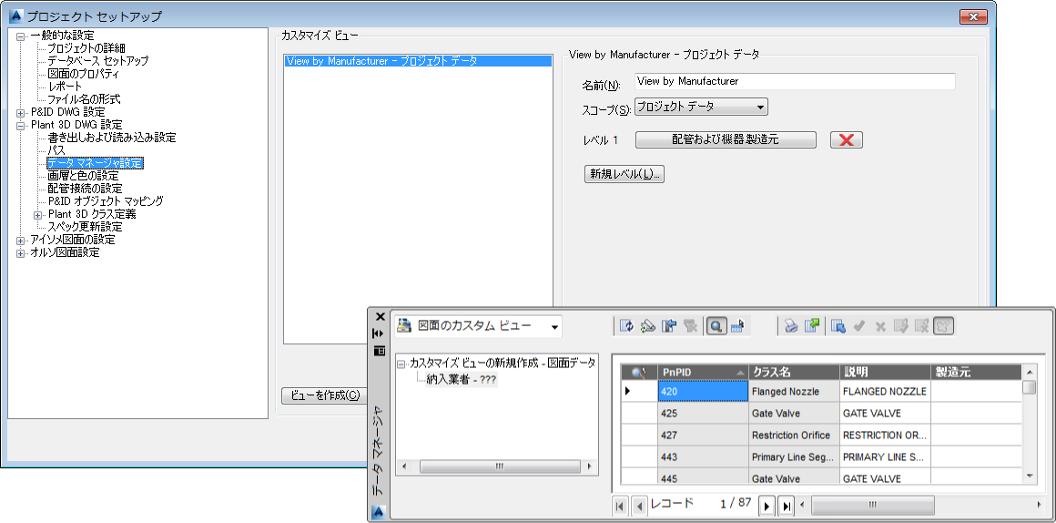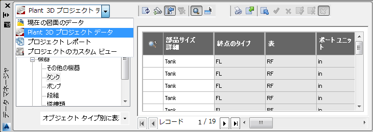 [データ マネージャ]を使用して、データをさまざまに表示することができます(プロジェクト別、図面別、組み込みレポート別など)。