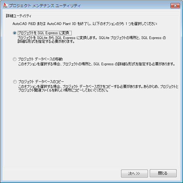 コマンド入力: プログラム フォルダ内の PnPProjectMaintenance.exeプロジェクトを、既定のデータベース(SQLite)から SQL サーバに変換できます。また、SQL サーバ データベースを異なるデータベース名またはサーバにコピーまたは移動することもできます。