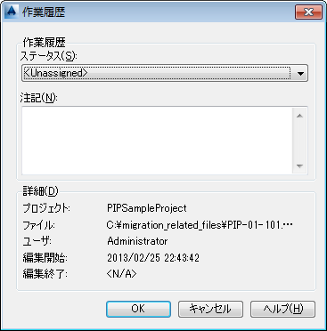 図面を開いたときまたは閉じたときに[作業履歴]ダイアログ ボックスが表示される設定になっている場合は、このダイアログでステータスと注記を入力することもできます。これは図面のバージョン管理機能(特定のデータ バージョンの保存、取得)ではないことに注意してください。