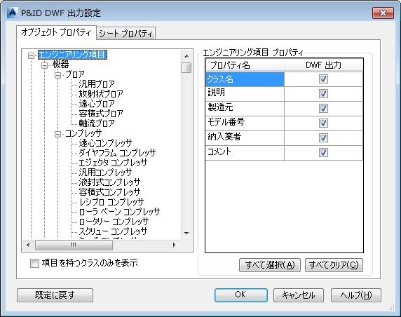 パブリッシュされた DWF ファイルに含めることができるオブジェクト プロパティのリストが表示されます。