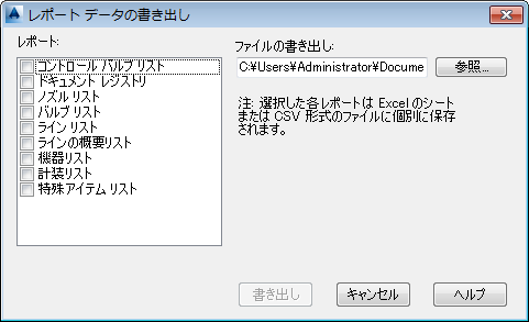 選択されたレポートを指定されたファイル名とフォルダに書き出します。選択されたレポートの種類ごとに、Excel スプレッドシートの個別のワークシートに表示されるか、個々の CSV ファイルとして表示されます。