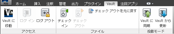 リボンから、Vault ログイン セッションおよび Vault プロジェクト ファイルを管理することができます。