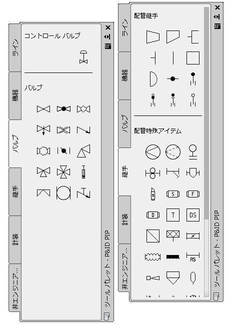 バルブやレデューサなどのインライン コンポーネントは、配管上に配置されます。