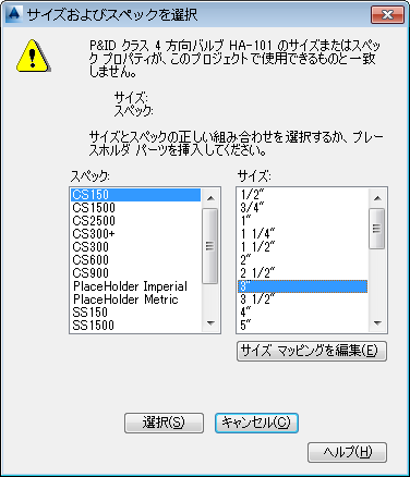 P&ID オブジェクトのサイズ プロパティまたはスペック プロパティは、対応するモデリング オブジェクトのサイズまたはスペックと異なる場合があります。オブジェクトをモデル内に配置する前に、適切なサイズおよびスペックを選択できます。