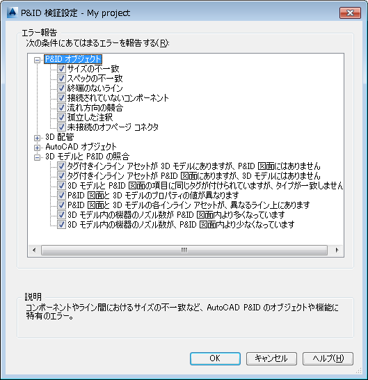 プロジェクトごとに、検証の実行時にフラグを付けるエラーの種類を指定します。検証の実行後、検出されたエラーを修正するか、無視することができます。