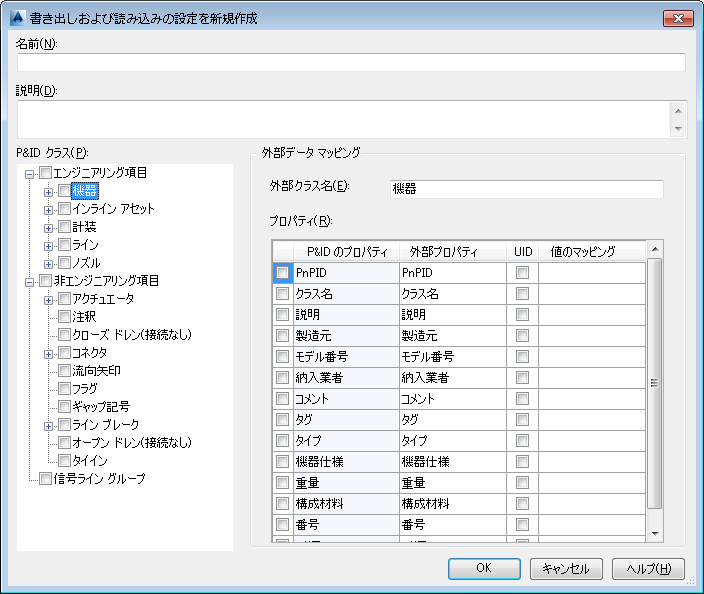 マップされたクラス名を決定します。既定では、AutoCAD P&ID クラスと同じ名前ですが、外部データクラス名に変更することができます。たとえば、AutoCAD P&ID クラスのセットに「エンジニアリング項目」という名前を付け、AutoCAD Electrical のような外部プログラムでは、類似クラスを「コンポーネント」と呼ぶようにすることができます。 [P&ID クラス]リストで[エンジニアリング項目]を選択し、[外部クラス名]フィールドに「コンポーネント」と入力します。