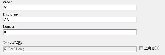 - 新しいファイル名を指定します。元のファイル名がファイル名形式(たとえば、[領域]、[分野]、そして番号を区切り記号で区切って組み合わせた形式)を使用して作成されている場合、[図面名を変更]ダイアログ ボックスにはこれらのフィールドが含まれることになります。