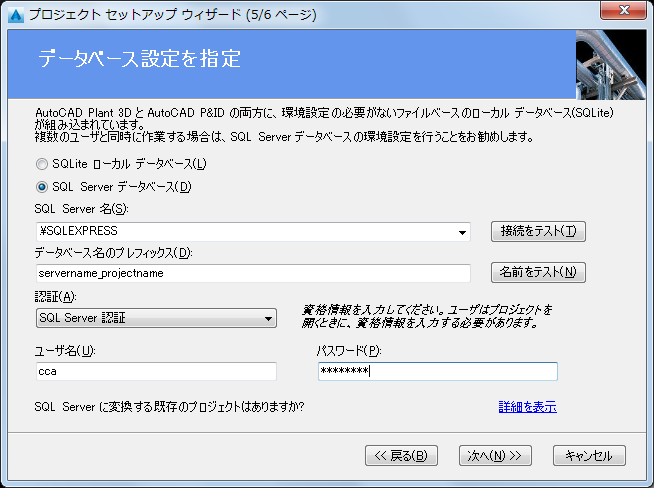 - [プロジェクト セットアップ ウィザード(5/6 ページ)]で、既定のデータベースを選択して[次へ]をクリックするか、SQL Express サーバ データベースを選択します。サーバ データベースを選択した場合は、次の操作をします。