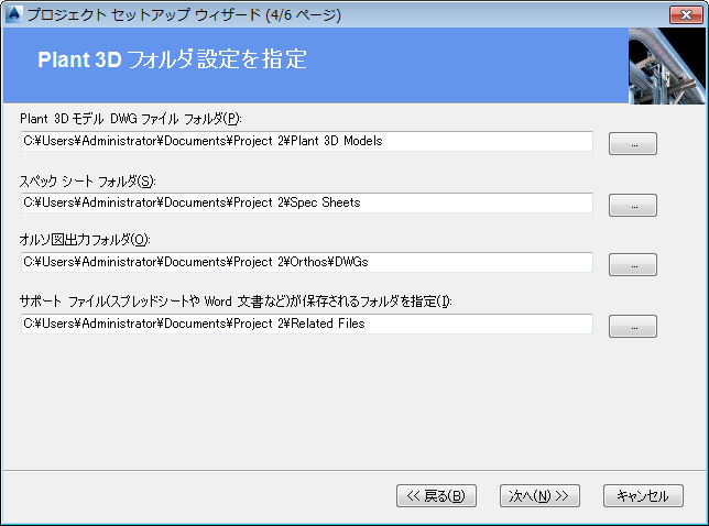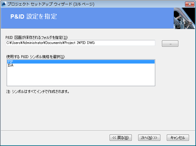 - [プロジェクト セットアップ ウィザード(3/6 ページ)]で、P&ID 図面のパスを入力し、P&ID ツール パレットの内容の規格を選択します。[次へ]をクリックします。