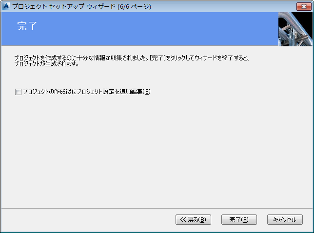 - [プロジェクト セットアップ ウィザード(6/6 ページ)]で、プロジェクトの既定の設定を変更する場合は、[プロジェクトの作成後にプロジェクトのプロパティを編集]チェック ボックスをオンにします。[完了]ボタンをクリックします。