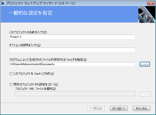 - [プロジェクト セットアップ ウィザード(1/6 ページ)]で、ボックスにプロジェクト情報を入力します。[次へ]をクリックします。