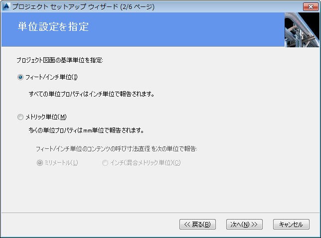 - [プロジェクト セットアップ ウィザード(2/6 ページ)]で、プロジェクトをフィート/インチ単位にするのかメートル単位にするのかを指定します。メートル単位を選択した場合は、コンテンツがフィート/インチ単位である場合の呼び径の単位を指定します。[次へ]をクリックします。