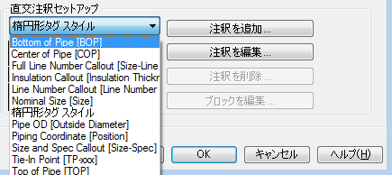 - [オルソ図注釈セットアップ]領域で、ドロップ ダウンリストから注釈(たとえば、[配管の下(BOP)])を選択します。[注釈を追加]をクリックします。オリジナルを修正するのは避け、コピーを修正するように心がけましょう。