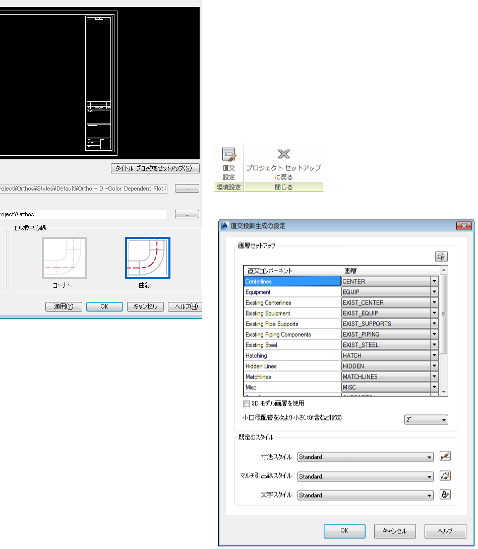 オルソ テンプレートと図面のパスを設定し、隠線配管やエルボ中心線などの既定を表示することができます。特定のオルソ コンポーネントの画層を指定することもできます。