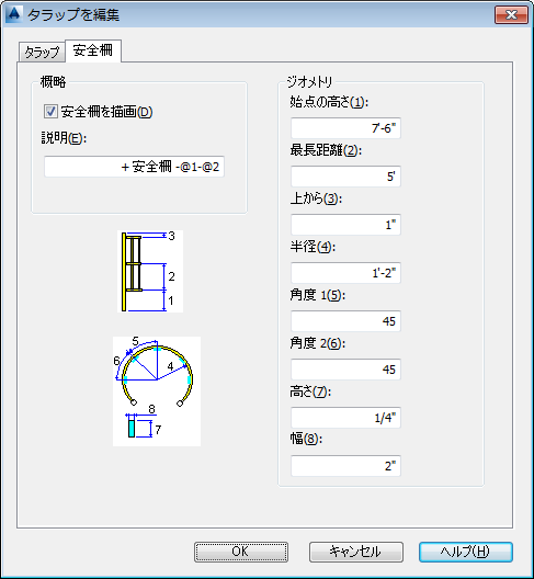 安全柵のジオメトリ設定を編集します。括弧内に示されている数値は、プレビュー イメージ内に表示されているジオメトリに対応しています。