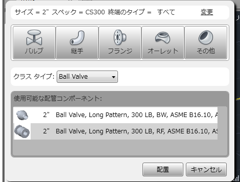 [使用可能な配管コンポーネント]で、コンポーネント([ボール バルブ、Long Pattern、300LB、RF]など)をクリックします。