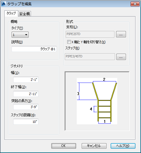 タラップのジオメトリ設定を設定します。括弧内に示されている数値は、プレビュー イメージ内に表示されているジオメトリに対応しています。