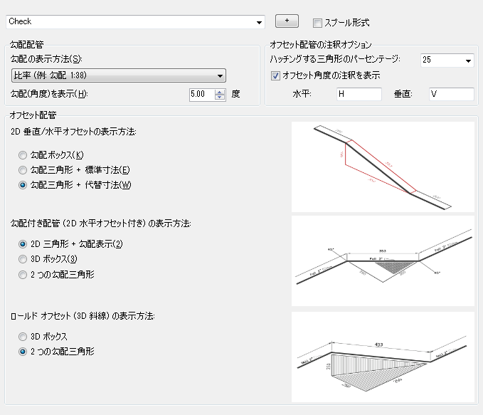勾配付き配管での水平(2D)オフセットの表示方法を指定します。