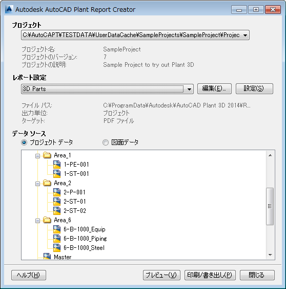 - [データ ソース]で、必要に応じて[プロジェクト データ]または[図面データ]をクリックします。[図面データ]をクリックした場合は、レポートの対象にする 1 つまたは複数の図面も選択する必要があります。