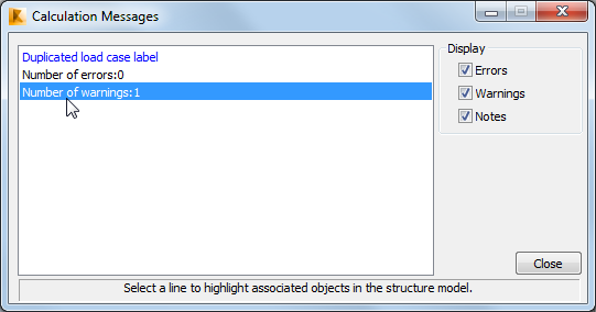 Note: If the model was defined properly there should not be any messages. However, if there are problems with the analysis, the Calculation Messages dialog box opens as shown below. Warnings prompt you to check any suspicious elements (no supports, disconnected part in the model, too weak elements, too many restrains, etc.). Some of the causes might be intentional and justified, but others might result from modeling errors and should be corrected before the analysis is run again.
