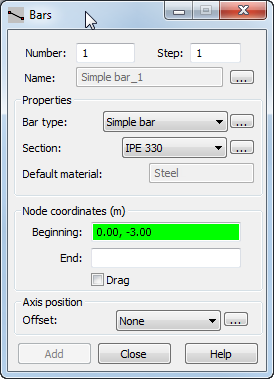 In the Bars dialog box, verify that the Section is IPE 330 , and then go to the graphical pane to start drawing the posts . Move the dialog box out of the way as needed.