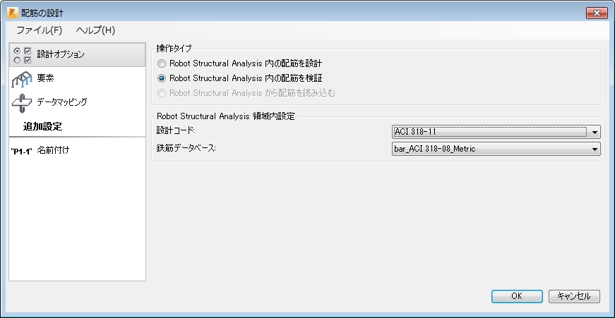 - リボンの[解析]タブから[解析およびコード確認]パネル、[配筋コード確認]の順に選択して、エクステンションを起動します。[配筋の設計]ダイアログで、[操作タイプ]から[Robot Structural Analysis 内の配筋を検証]を選択します。