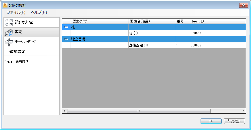 [要素]タブには、Extension でサポートされている選択した要素(コンクリート梁、柱、独立基礎)のリストが表示されます。要素は、タイプ(梁、柱、独立基礎の 3 つの主要なグループ)、Revit ファミリ インスタンスの[記号]パラメータ、部品形状(長さ、断面形状、寸法)、配筋パラメータに基づいてグループ化されます。また、[グループ化]オプションをオフにできます。次に、すべての要素は個別に考慮され、Robot RC プロジェクトの数が Revit で選択されている部品の数と同じになります。