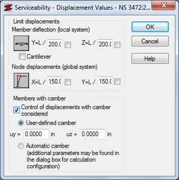 It is possible to define limit displacements (member deflections in the directions X and Y, node displacements in the directions X and Y) and, additionally, to decide - while determining the limit deflections of a member - whether the member is a cantilever. Options in the lower part of the dialog box allow defining parameters of a member with camber: