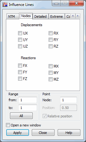 The options in the dialog let you indicate the nodal quantity for which the influence lines are presented: