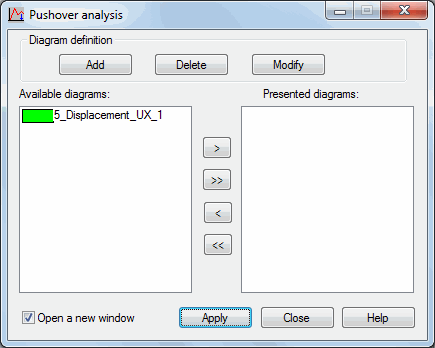 After diagrams are defined and moved to the Presented diagrams field in the Pushover analysis dialog, clicking Apply displays a view with the selected diagrams. The diagrams are presented in the same manner as for time history analysis.