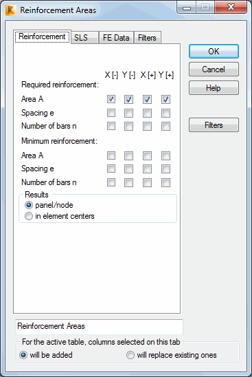 Select the Reinforcement tab in the Reinforcement Areas dialog to select quantities of plate and shell reinforcement for presentation.