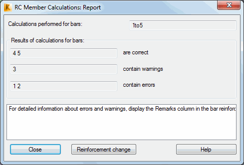 The Calculations performed for bars field displays the numbers of RC members that underwent design. These members must be an RC beam or RC column. A theoretical (required) area of reinforcement in RC members can be determined only for them. Other element types that will be entered on the design element list in the Calculations dialog box are ignored automatically.