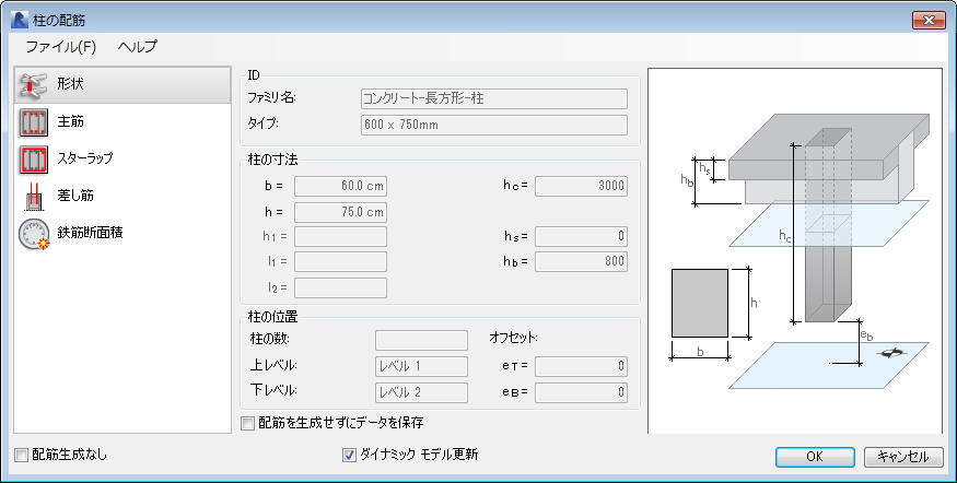 他のタイプの柱の断面(例えば、Z 断面、半円形断面等)を定義できますが、これらの断面タイプに対して柱の配筋は生成されません。