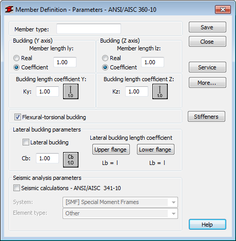 - Opens the Member definition - additional parameters dialog which allows you to define the remaining member type parameters described in the code such as: equivalent moment factor, section parameters, etc.
