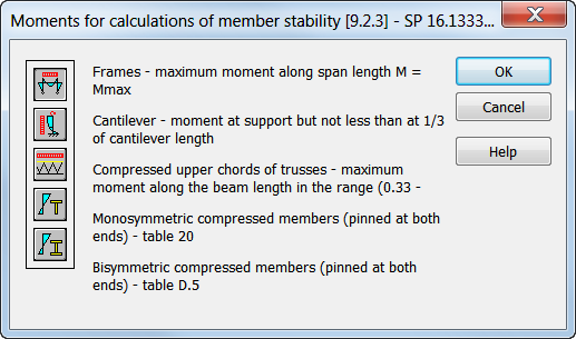 The options included in this dialog enable defining schemas of bending moment distribution along the length of an analyzed element. This information is applied in stability verification of elements subjected to simultaneous action of compressive force and bending moments (see point 9.2.3, Table 20 and Annex D).