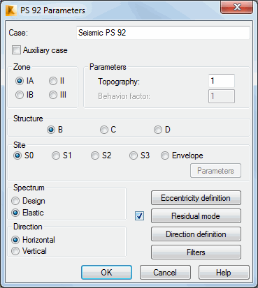 Parameters of a structure seismic analysis depend on a seismic code used during calculations of a structure influenced by seismic impact. Select French seismic code AFPS ("Recommendations Association Francaise du Genie Paraseismiques 90") or PS 92 ("Regles Parasismiques Francaise 1992") in the New Case Definition dialog or click Parameters in the Analysis Type dialog.