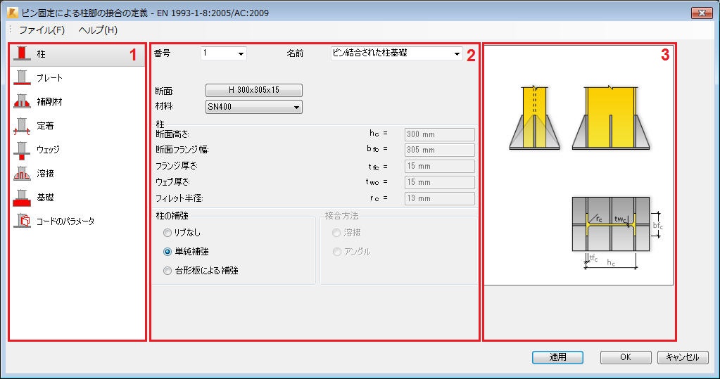 柱-基礎接合 (ピン固定/固定による柱脚の接合) の生成ダイアログは 3 つの主要部分に分かれています。