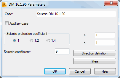 Parameters of a structure seismic analysis depend on a seismic code used during calculations of a structure influenced by seismic impact. Select Italian seismic code DM 16.1.96 in the New Case Definition dialog or click Parameters in the Analysis Type dialog.