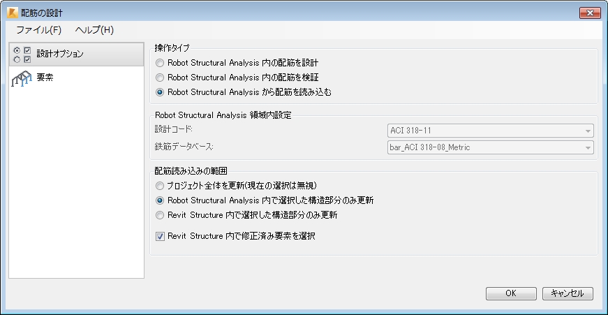 注: RC 構造部品に配筋(Robot から読み込まれた配筋など)が存在する状態で、いずれかの Revit Extensions for Revit ([梁の配筋]、[柱の配筋]など)を使用して配筋(梁や柱の配筋など)を生成すると、Robot から読み込まれた配筋は Revit Extensions for Revit で生成された配筋によって上書きされます。